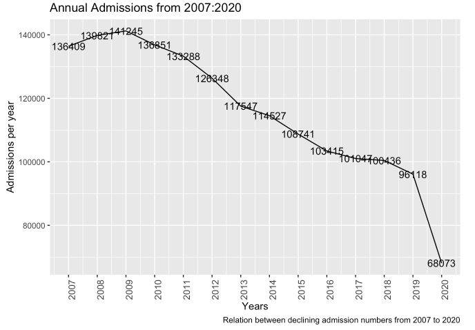 - Total number of reported admissions transpired each year from 2007 to 2020