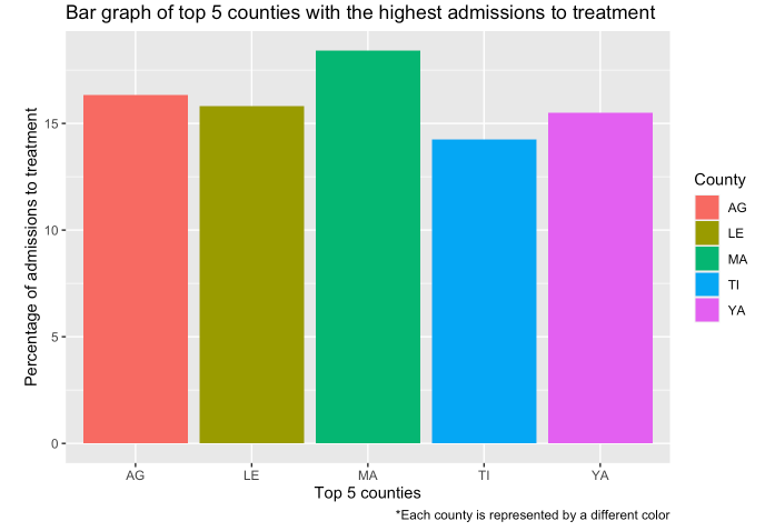 The bar plot generated from a subset of the OASAS admissions data represents the top five counties with the highest admission rates. The plot provides an easy-to-read visual representation of the percentage of admissions in these counties, making it easy to identify which counties have the highest rates. From the bar plot, we can see that Madison county has the highest percentage of admissions at approximately 18.4%. This suggests that there may be a higher incidence of substance abuse and addiction in this county than in others. The other four counties in the top five have slightly lower percentages of admissions ranging from 14% to 17%, indicating that they also have a significant number of admissions. It is important to note that this data represents a percentage of admissions and not the absolute number of admissions. Therefore, the higher percentage of admissions in Madison county does not necessarily mean that they have the highest number of admissions overall. The information provided by this bar plot can be useful in identifying which counties may require greater resources for substance abuse treatment and prevention efforts.